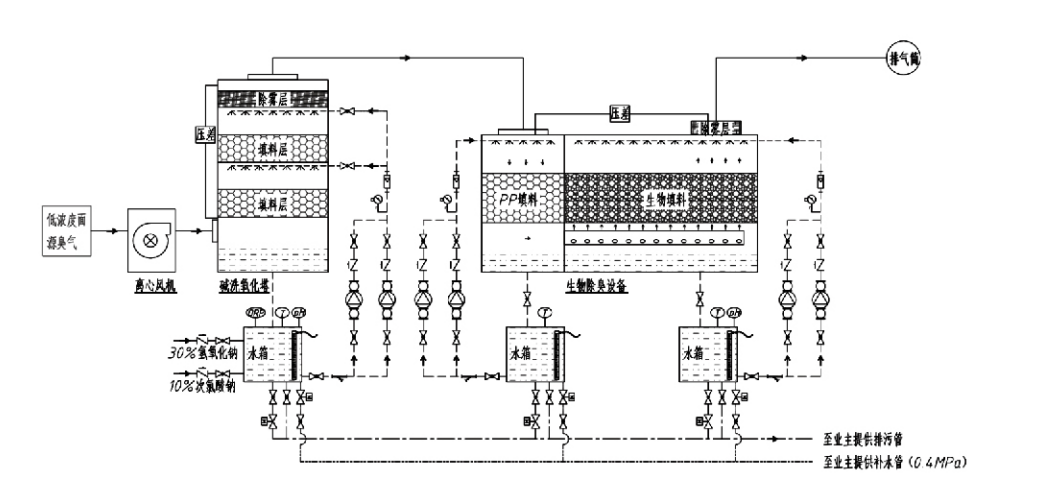 Lưu ý: Quy trình này chủ yếu áp dụng để xử lý các loại khí có mùi hôi bao gồm các hợp chất chứa lưu huỳnh (H₂S, SO₂, mercaptan, sulfua, v.v.), các hợp chất chứa nitơ (NH₃, trimethylamine, amit, v.v.), halogen và các dẫn xuất của chúng (khí clo, hydrocacbon halogen hóa, v.v.).